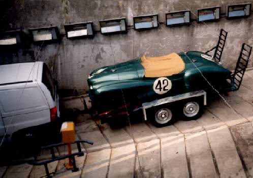 The 1951 Le Mans race car arrives at Arras behind our recovery vehicle. Restoration was only commenced at the end of February, and the car very very nearly made it under its own power.